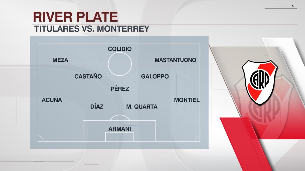 河床首发:1-阿尔玛尼、4-蒙铁尔、17-保罗-迪亚斯、21-阿库尼亚、28-夸尔塔、22-卡斯塔尼奥、24-恩佐-佩雷斯、30-马斯坦托诺、34-加洛珀、8-梅萨、11-科利迪奥
