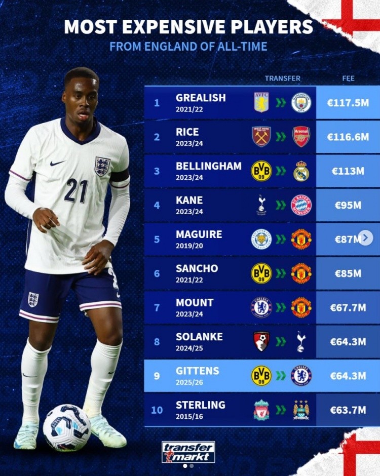 7月6日讯 切尔西已经官宣签下多特边锋吉滕斯,《转会市场》统计显示后者也是英格兰历史转会费第9贵球员。