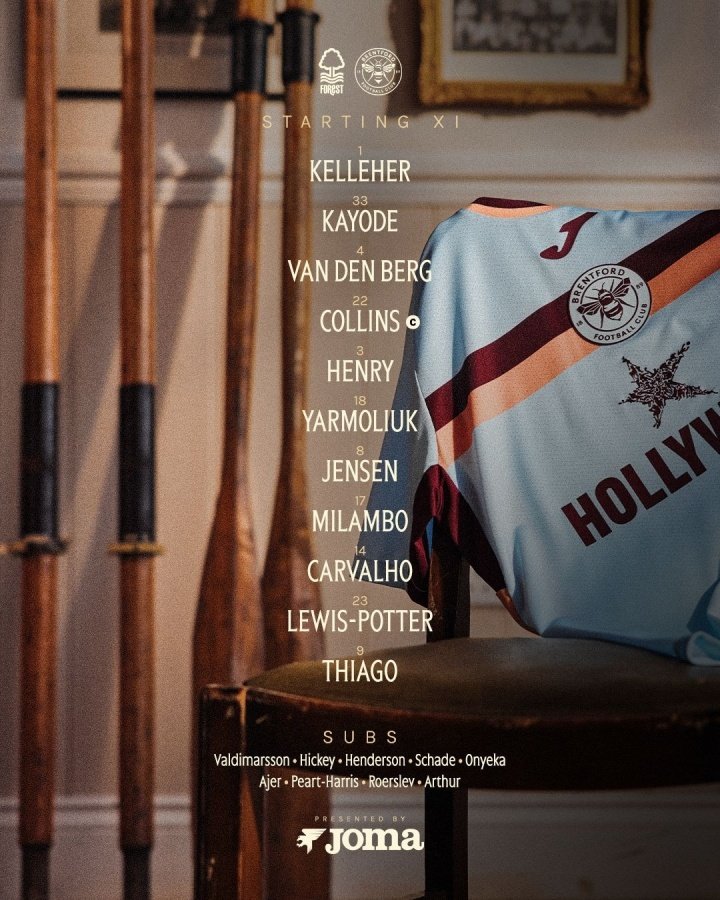 布伦特福德首发:1-凯莱赫、3-里科-亨利、4-范登贝尔赫、22-科林斯、23-刘易斯-波特、33-卡约德、8-延森、14-卡瓦略、18-亚尔莫柳克、9-伊戈尔-蒂亚戈、17-米兰博