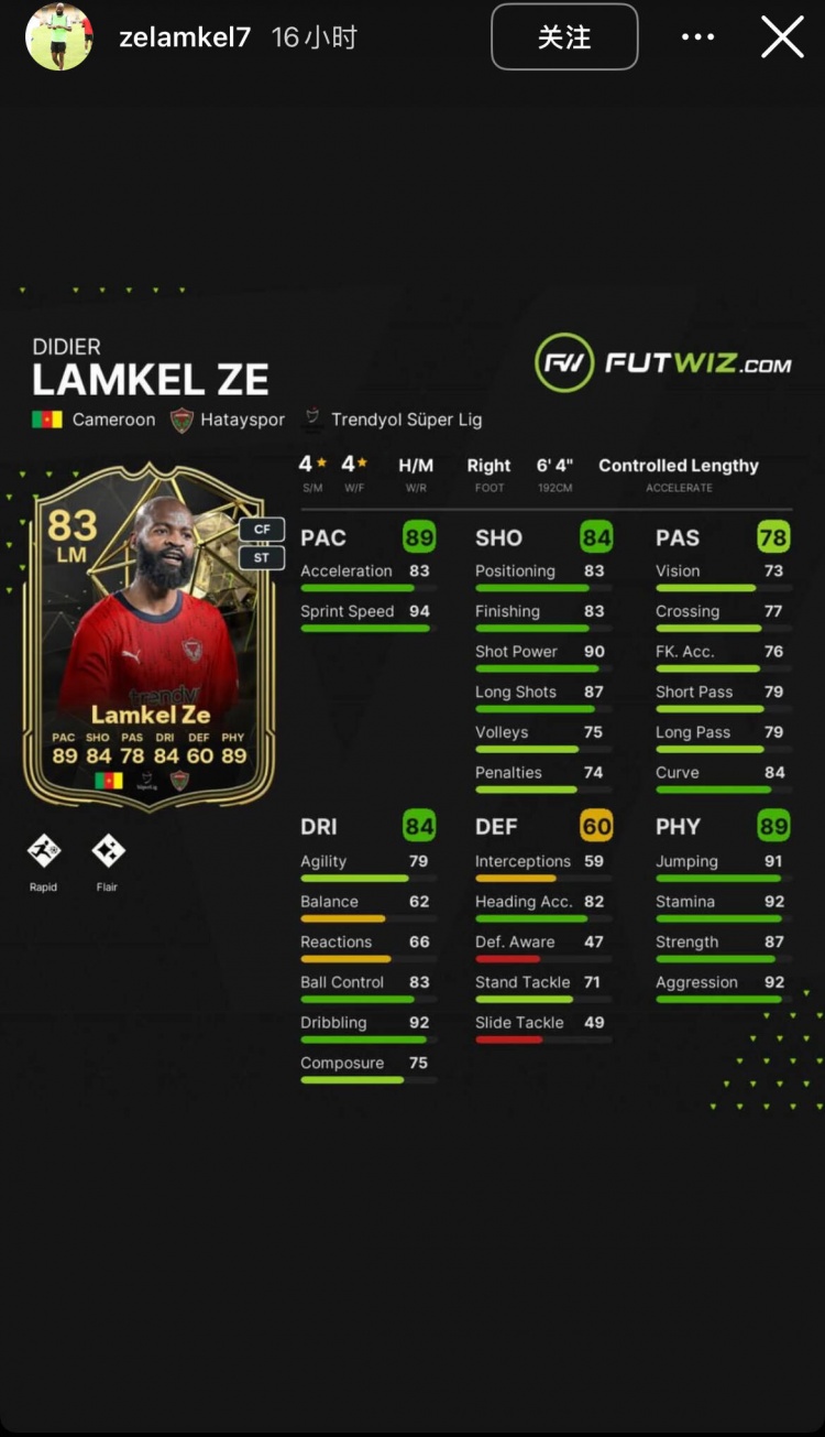 6月13日讯 据博主“青岛体坛那些事儿”社媒报道,近日喀麦隆国脚兰克尔-泽连续更新社媒,晒出了青岛海岸风光,以及自己的个人集锦、在FutWiz上的个人评分等。