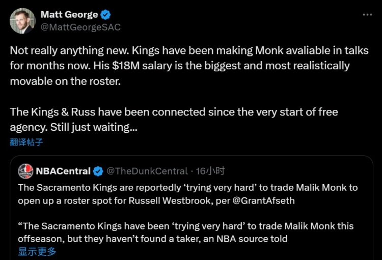 Matt George转发了一则国王正努力交易走蒙克,为引进威少腾出名额的报道,在旁边写道:“算不上新鲜事。几个月来,国王一直在谈判中把蒙克列为可交易的,他的1800万薪水是这支国王阵中的大合同里,最有可能能交易出去的资产。
