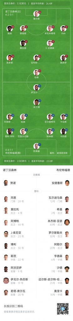 诺丁汉森林首发:3-内科-威廉姆斯、26-塞尔斯、5-穆里略、31-米伦科维奇、34-埃纳、6-桑加雷、8-E-安德森、10-吉布斯-怀特、7-奥多伊、11-伍德、14-恩多耶