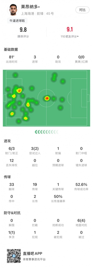 莱昂纳多本场数据如下: